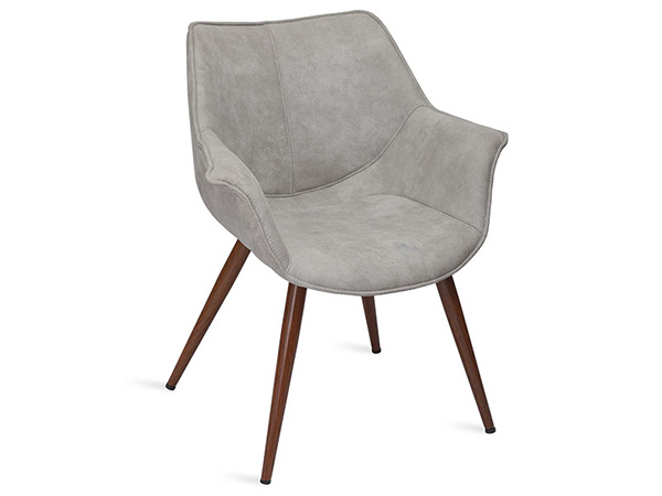 Silla tapizada en microfibra, con base de metal apariencia madera.