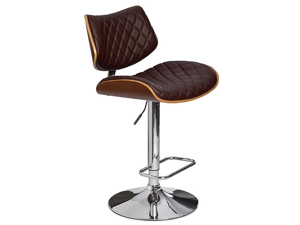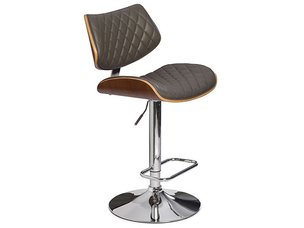 Banco de madera termo formada, tapizado en imitación piel y base hidráulica en metal cromado.