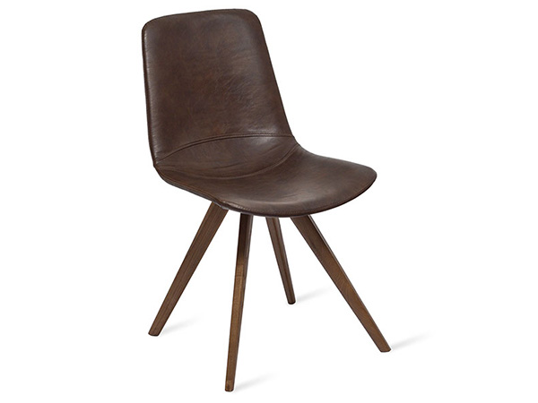 Silla tapizada en imitación piel tabaco con base de madera color nogal.