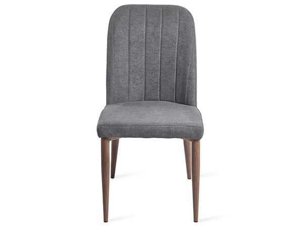 Silla tapizada en tela tipo chenille con base de metal apariencia madera color nogal.