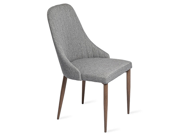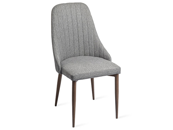 Silla tapizada en tela con base de madera color nogal.