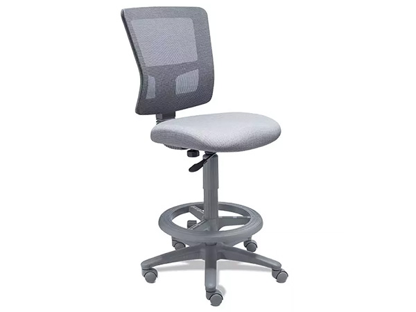 Silla operativa de la familia quadra versión banco alto con diseño ergonómico. Cuenta con un marco estructural color gris, con ajustable de altura en respaldo por medio de sistema de cremallera, además de un aro descansa pies. Compatible también con ciertos accesorios; descansa brazos fijos, entre otros.