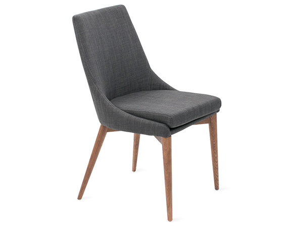 Silla tapizada en tela tipo lino con base de madera color nogal.